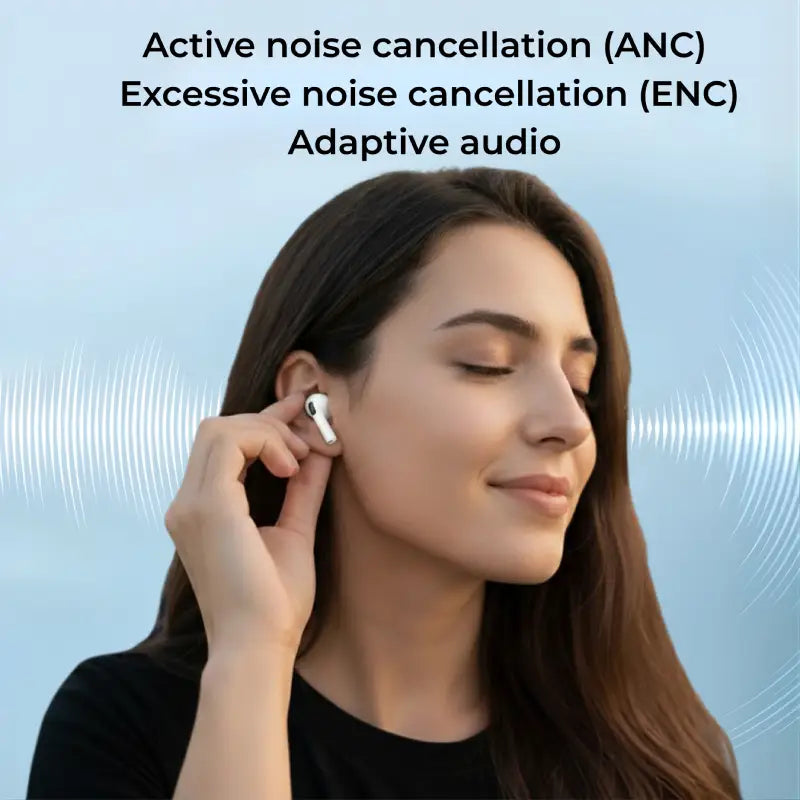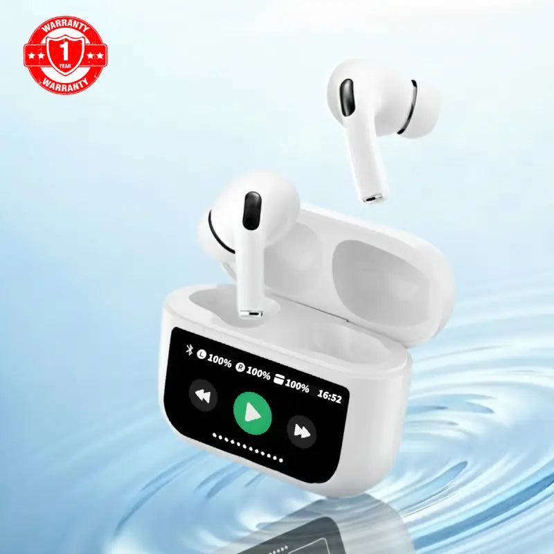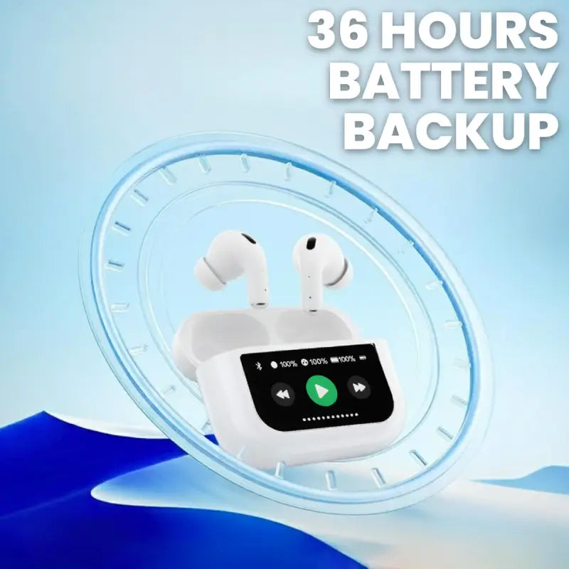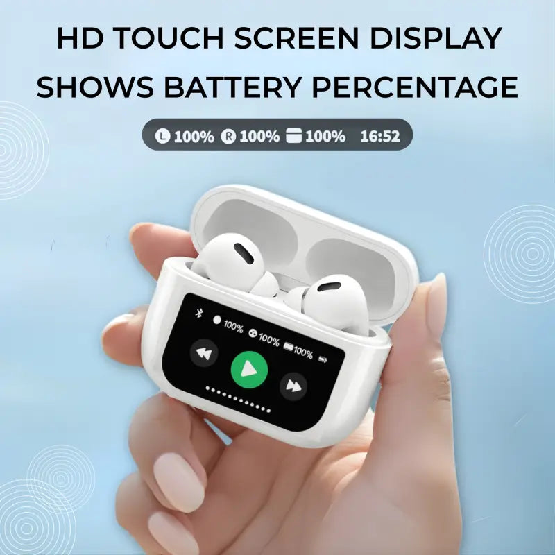 Opinia Pulse offers a premium smart wireless earbud experience with a touchscreen charging case, 100% Active Noise Cancellation, Spatial Audio, and up to 36 hours of playback time.